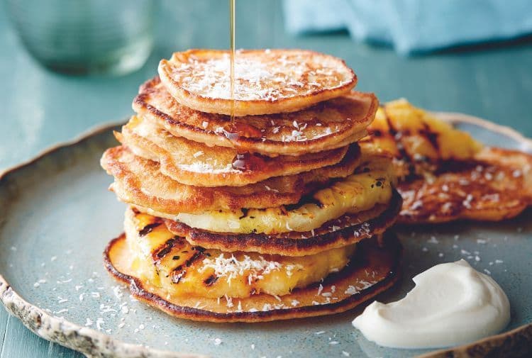 Fair speltpandekager med grillede ananasstykker. Den helt perfekte morgenmad til februar.