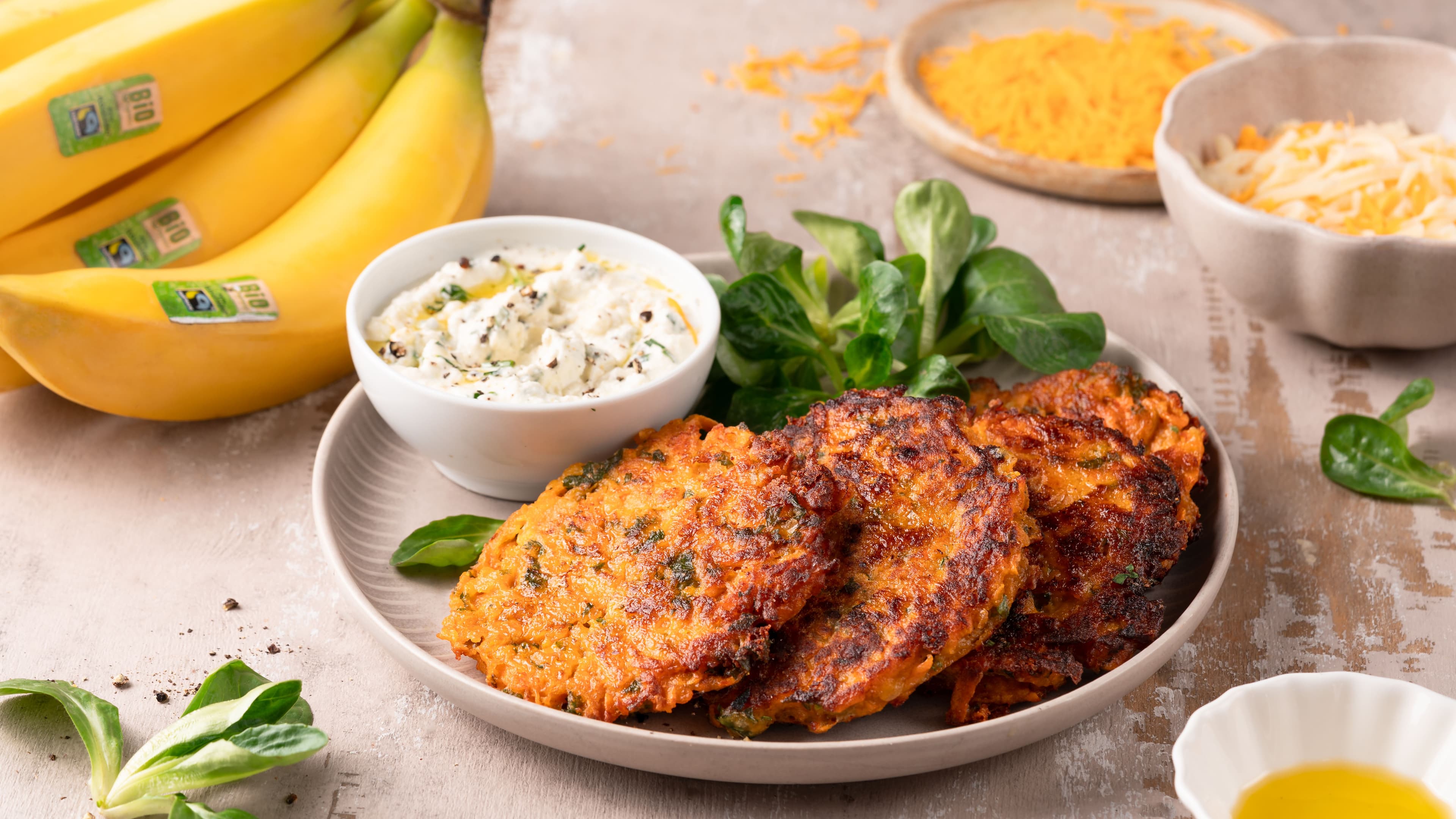 Würzige Bananen- und Süsskartoffel-Fritters mit rauchigem Paprika, geschmolzenem Käse und einer pikanten Feta-Joghurt-Sauce.