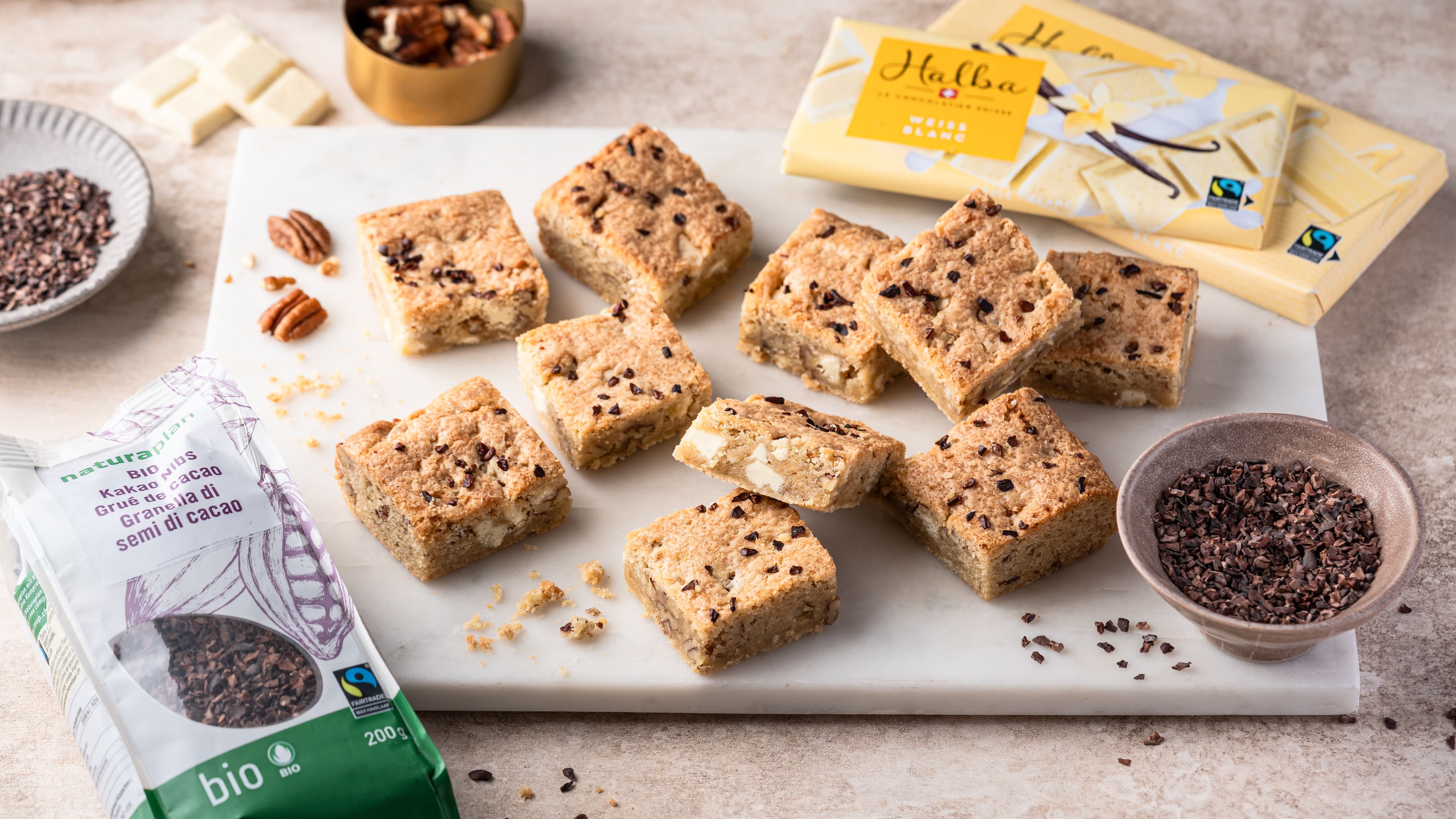 BLONDIES MIT KAKAONIBS UND WEISSER SCHOKOLADE